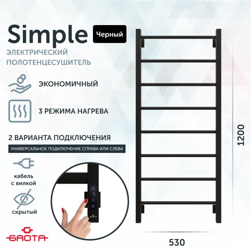 Полотенцесушители фирмы Grota - это современный дизайн, надежное качество, долгий срок службы! br Универсальное подключение к сети дают возможность подключения полотенцесушителя и слева и справа. Скрытое подключение обеспечивает эстетичный внешний вид при котором нет видимых проводов. В комплекте так же есть кабель-вилка длиной 100 см для обычного подключения через розетку.br Нагревательным элементом в электросушилке является греющий кабель аналог теплого пола, кабель заправляется внутрь каждой трубы и передает тепло на поверхность полотенцесушителя. Кнопка включения/выключения и таймер на 2 / 4 / 6 часов , который позволяет включать изделие на ограниченное время. Эта функция дает возможность значительно экономить электричество.br br ТЕХНИЧЕСКИЕ ХАРАКТЕРИСТИКИ:br