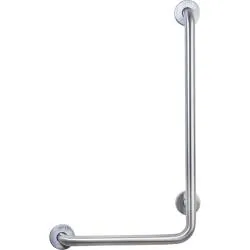 Поручень угловой левый под прямым углом 90* для людей с ограниченными возможностями. Изготовлен из нержавеющей стали AISI 304. Имеет 3 точки крепления, белый. Диаметр Ø 32 мм, толщина 1,5 мм. 38 мм от стены.