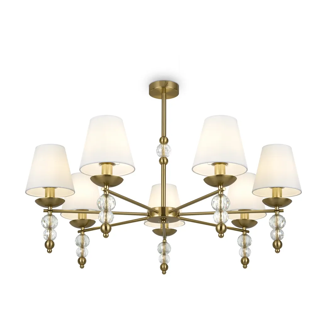 Материал абажура — ткань, цвет — белый. Металлическая арматура в цвете латунь обрамлена хрустальными бусинами. Источник света — лампы с цоколем Е14. Степень защиты — IP20.