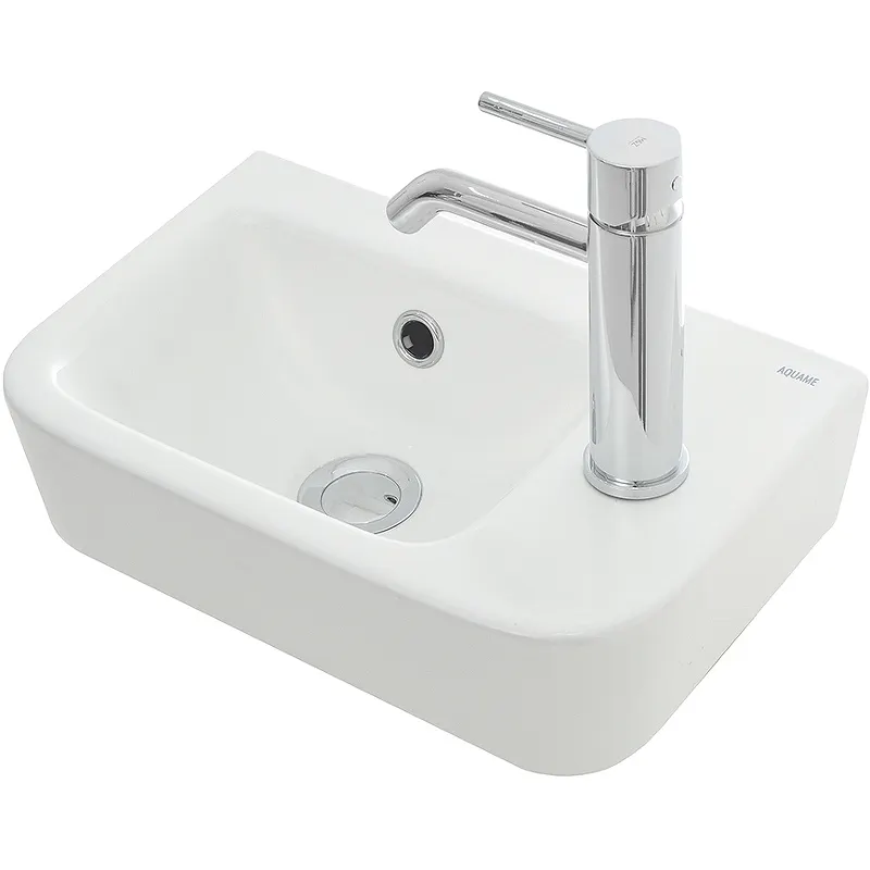 Раковина AQUAme 38 R AQM5006R.Характеристики: Цвет: белый глянцевый. Материал: фаянс. Размер (ШхВхГ): 375х135х245 мм. Отверстия под смеситель: 1. Расположение смесителя: справа. Перелив. Монтаж: накладной. Форма: прямоугольная. Антигрязевое покрытие. Антибактериальное покрытие. Водоотталкивающее покрытие. В комплекте поставки: раковина.
