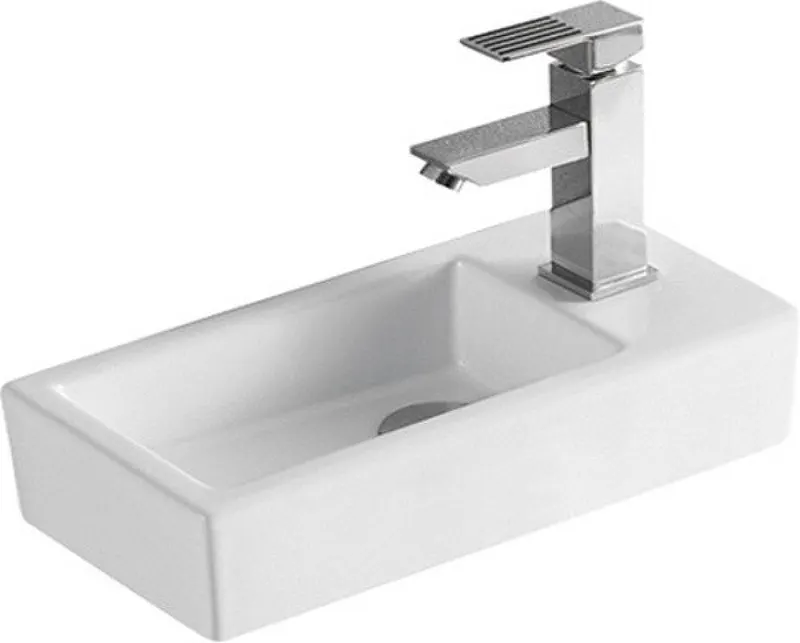 Раковина CeramaLux 36 9272L.Характеристики: Цвет: белый. Материал: фаянс. Ориентация: левая. Размеры (ШхВхД): 36,5х9х18 см. Внутренний размер чаши (ШхВхД): 25х6х13 см. На одно отверстие под смеситель. Чаша раковины слева, отверстие под смеситель справа. Межосевое расстояние под крепеж: 24 см. Диаметр слива: 4,5 см. Форма: прямоугольная. Установка: подвесная, накладная. Монтаж: на стену, на столешницу. В комплекте поставки: раковина.