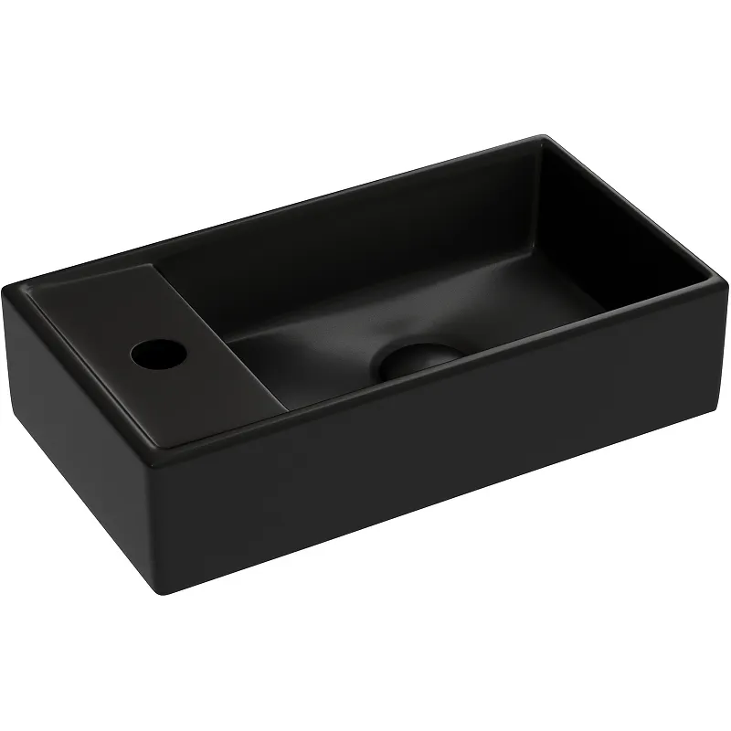 - Современный дизайн умывальника: Черный матовый цвет и прямоугольная форма делают данную раковину стильным акцентом в любой ванной комнате.