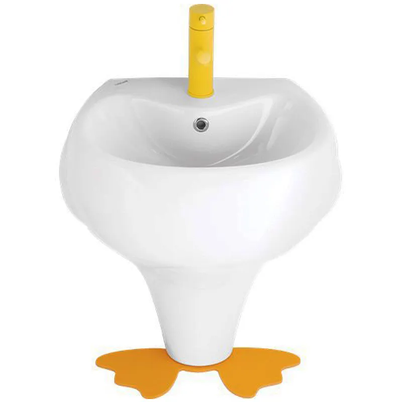Напольная детская раковина Creavit Ducky 52 DC052-00CB00E-0000.Технические данные: Цвет: белый. Материал: санфарфор. Покрытие с ионами серебра: подавляет образование бактерий на 99,9%. Размеры (ШхДхВ): 52,3 х 39,5 х 63,3 см. Глубина чаши: 17 см. Диаметр слива: 4,5 см. Отверстие для перелива воды. Отверстие под смеситель. Монтаж: напольный, на стену. В комплекте поставки: чаша раковины; крепления.