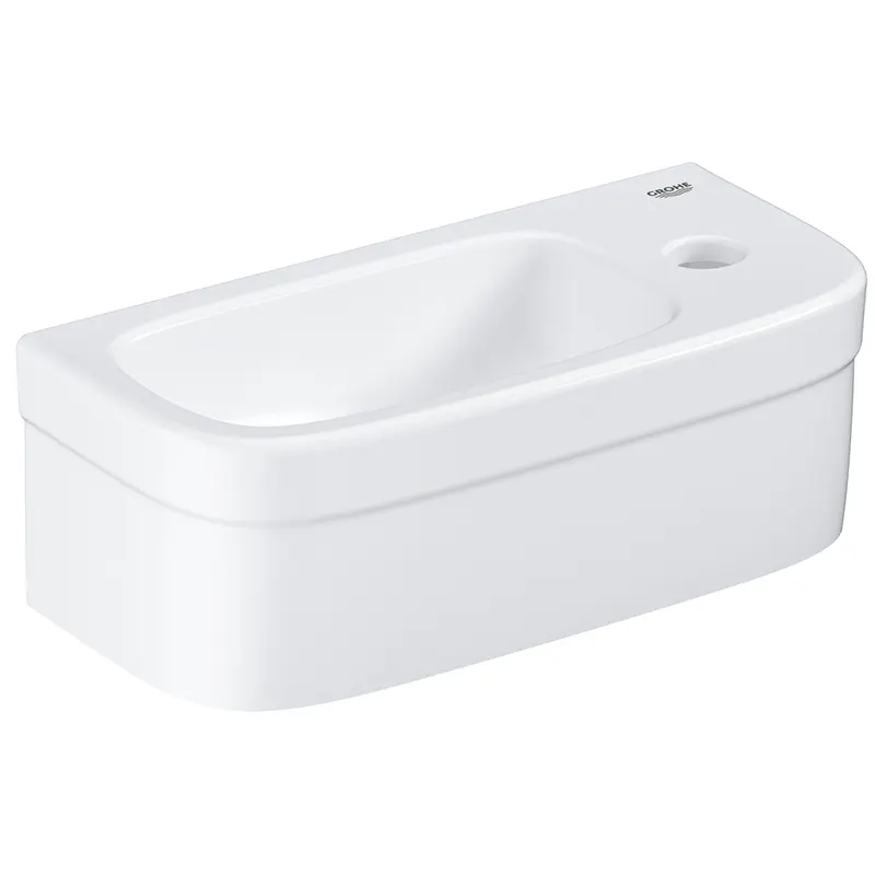 Подвесная мини-раковина Grohe Euro Ceramic 37 39327000. Лаконичный и универсальный дизайн изделия дополнит большинство интерьеров ванных комнат различной стилистической направленности.Изготовлена из сантехнического фарфора - гладкого и прочного материала, отличающегося низкопористой поверхностью. Раковина не впитывает загрязнения и не изменяет свой цвет на протяжении всего срока службы.Монтаж: подвесной, крепление к стене.С переливным отверстием.С одним отверстием под смеситель справа.Габариты (ДШВ): 18x37x12 см. Глубина чаши раковины: 10 см.В комплекте поставки: раковина.