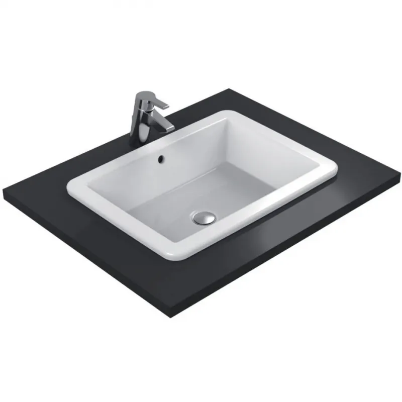 - Оптимальные размеры: раковина Ideal Standard 59x43,2 см идеально подходит для установки на столешницу, обеспечивая комфортное использование пространства.