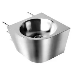 Раковина настенная угловая округлая выполнена из нержавеющей стали AISI 304 и имеет антивандальный корпус и имеет специальные крепления, которые защитят ее от ударов и стороннего демонтажа, которые установлены с левой стороны. Прекрасно подходит для публичных мест с большой проходимостью