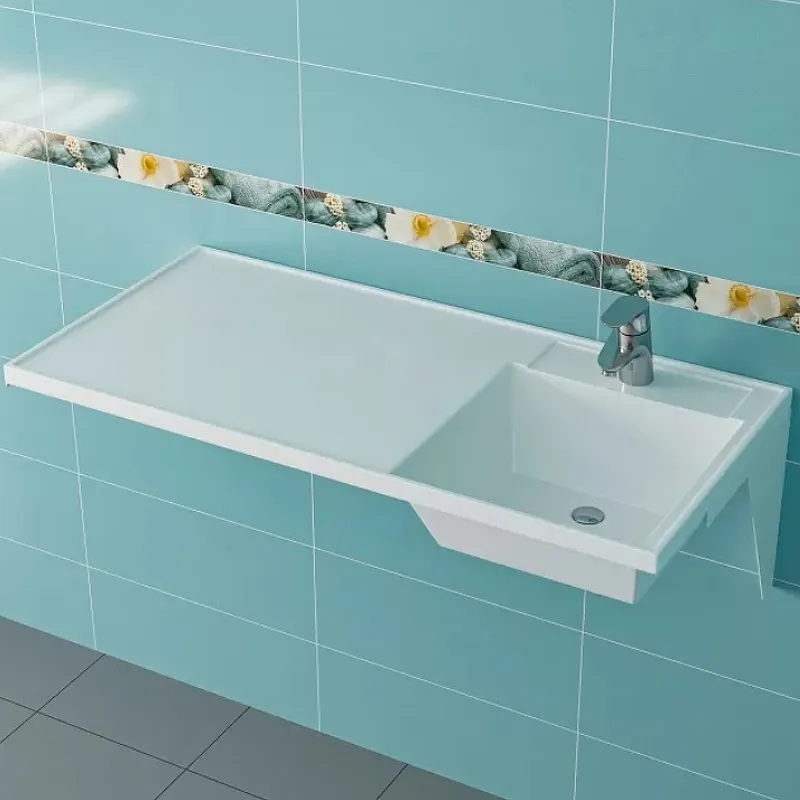 - Экономия пространства в ванной комнате: Данная раковина-столешница позволяет разместить стиральную машину прямо под ней, обеспечивая удобство и функциональность.