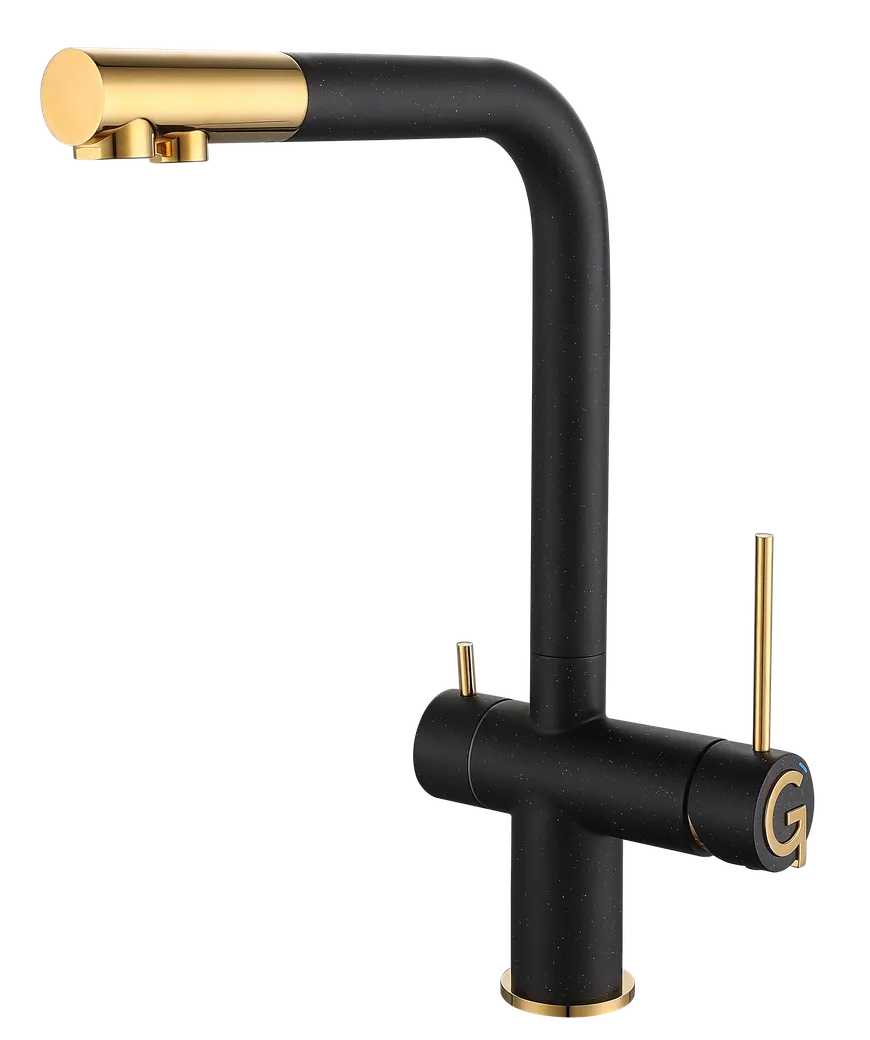 Преимущества Rivelato Смеситель для кухни Lugano Г-обр. с краном питьевой воды D-35мм nero oro арт.