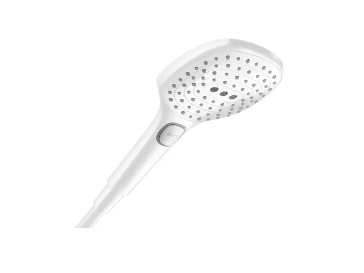 Ручной душ, Hansgrohe, Raindance Select E, размер душевого диска, мм-120, форма-квадратная, количество режимов-3, тип струи-Rain, RainAir, Whirl, цвет-белый матовый, переключение типов струи с помощью кнопки Select, соединительная резьба G 1/2" арт-26520700