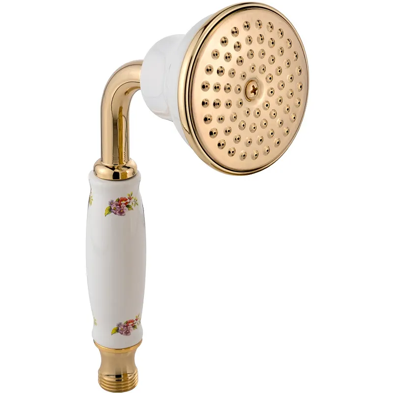 Ручной душ Migliore Provance 19476.Характеристики: Цвет: золото с белой ручкой. Материал: латунь, керамика. Форма лейки: круглая. Диаметр лейки: 78 мм. Количество режимов струи: 1. Стандарт подводки: G 1/2. В комплекте поставки: ручной душ.