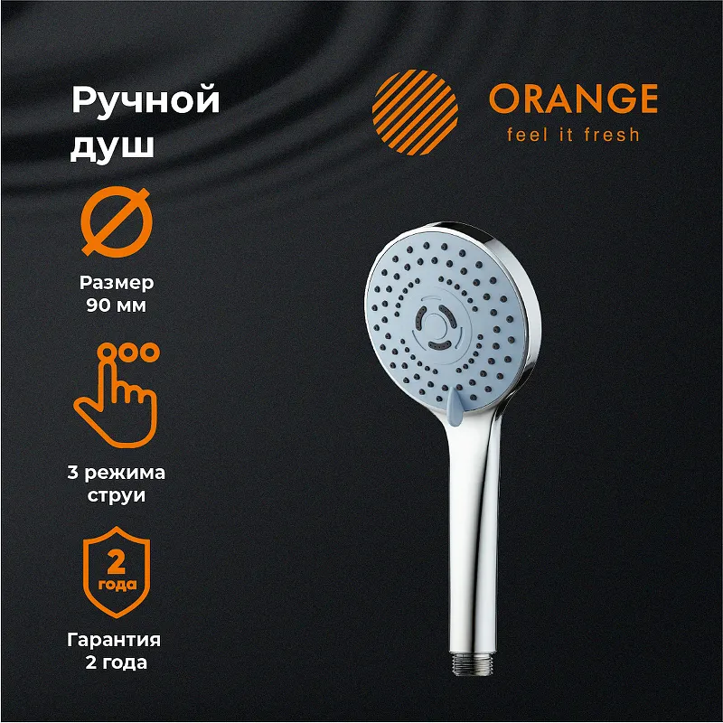Ручной душ Orange OAS01.Цвет: хром.Количество режимов работы лейки: 3.Размеры душевой лейки: 90х240х40 мм.Стандарт подводки: 1/2.Форсунки с функцией легкой очистки от известкового налета.В комплекте поставки:лейка для душа.