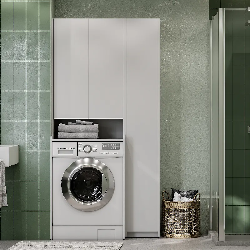 - Оптимальное использование пространства: Шкаф пенал подходит для установки над стиральной машиной, что позволяет эффективно использовать вертикальное пространство.