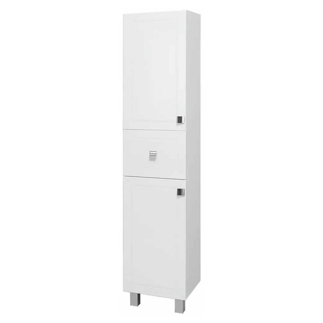 В моделях OSTIN белые глянцевые фасады с фрезеровкой повторяют правильные формы раковины и прекрасно гармонируют с изящными квадратными хромированными ручками. Простота форм, строгий геометрический рисунок на фасадах, отсутствие лишних декоративных элементов – вот отличительные черты данной коллекции. Фасад и корпус модели выполнены из МДФ и ЛДСП, облицованы глянцевой пленкой ПВХ, которая совершенно спокойно выдерживает любые влажные условия. Шкаф-пенал напольный OSTIN 40см оснащен 1 выдвижным ящиком и 2 отделениями с распашными дверками. Ящик на шариковых направляющих с доводчиком. Дверцы закрываются плавно и мягко. Удобные квадратные ручки дают возможность легкого открытия фасадов; полноценные полки и ящики под хранение обеспечивают порядок внутри. Пенал в левом исполнении (петли слева).