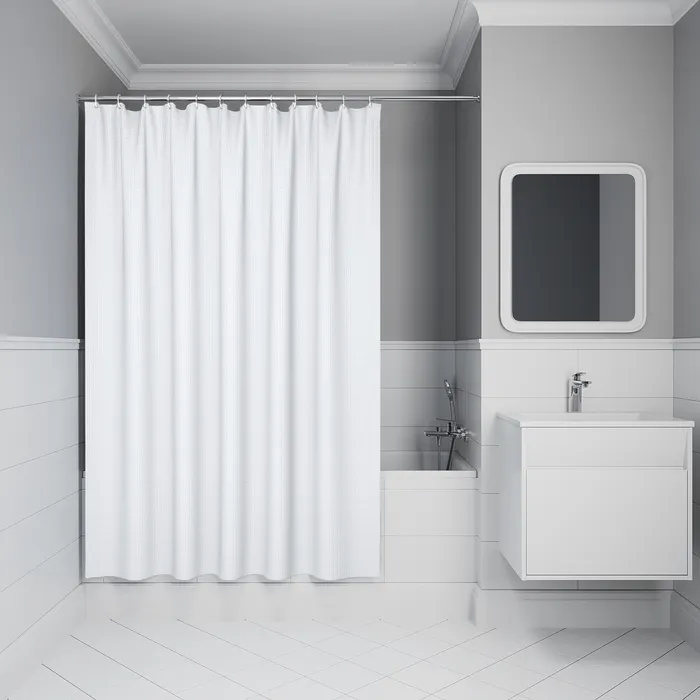 Однотонная текстильная штора для ванной белого цвета с фактурным рисунком «вафля». Напоминает классические текстильные шторы и соответствует актуальному тренду оформления ванной как уютной жилой комнаты. • Изготовлена из износостойкого полиэстера с водоотталкивающей пропиткой. При попадании на ткань вода скатывается каплями. • По верхнему краю расположены 12 хромированных металлических люверсов. • Без колец в комплекте. • Штора имеет утяжеляющую нить по нижнему краю, которая позволяет избежать задирания ткани. • Легко ухаживать: шторку для ванной комнаты можно стирать в стиральной машине в деликатном режиме и гладить утюгом на минимальной температуре. Гарантия на текстильные аксессуары IDDIS® – 1 год. (с) Авторский текст, октябрь 2023 г.