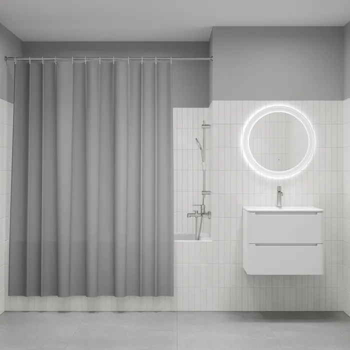 Текстильная светло-серая штора для ванной будет гармонично смотреться и в светлом, и в темном интерьере. Увеличенный размер – 200х240 см. • Изготовлена из износостойкого полиэстера с водоотталкивающей пропиткой. При попадании на ткань вода не впитывается, а скатывается каплями, даже при сильном напоре воды. • В комплекте 12 колец С-формы из прозрачного пластика. • По верхнему краю расположены 12 прозрачных пластиковых люверсов. • Штора имеет утяжеляющую нить по нижнему краю, которая позволяет избежать задирания ткани. • Легко ухаживать: шторку для ванной комнаты можно стирать в стиральной машине в деликатном режиме и гладить утюгом на минимальной температуре. Гарантия на текстильные аксессуары IDDIS® – 1 год. (с) Авторский текст, август 2025 г.