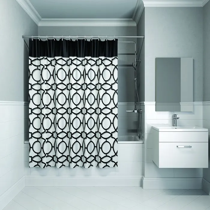 - Комплектация: В комплект входят кольца, что упрощает установку шторки для ванной.