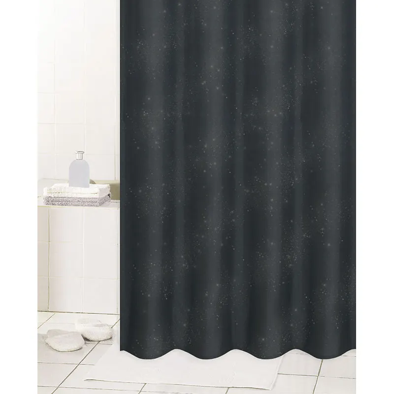 Занавеска для душа из полиэстера с отделкой из набивных блёсток.br Размер: 180x200мм, металлические люверсы-12шт., свинцовый утяжелитель, белые кольца-12 шт. в упаковке с подвесом. br Рекомендации по уходу: деликатная стирка при температуре не более 30 градусов, сушка в естественных условиях, не гладить и не отбеливать. После стирки можно замочить в теплой соленой воде для исключения разводов от порошка.br Преимущества: эстетичный внешний вид, износостойкость, приятная на ощупь, создает комфорт и уют, подходит к любому типу карнизовbrbr# занавеска для ванны # штора