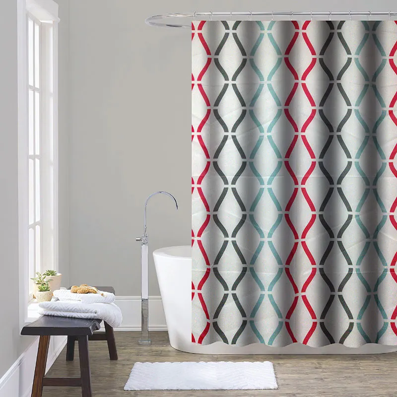 Занавеска для душа из 100 полиэстера с принтом с повторяющимся дизайном, размером 180x200мм.brКомплектация: Металлические люверсы-12шт., свинцовый утяжелитель, белые кольца-12 шт. в блистерной упаковке.br Рекомендации по уходу: деликатная стирка при температуре не более 30 градусов, сушка в естественных условиях, не гладить и не отбеливать.br После стирки можно замочить в теплой соленой воде для исключения разводов от порошка.br Преимущества: эстетичный внешний вид, износостойкость, приятная на ощупь, создает комфорт и уют, подходит к любому типу карнизовbrbr# занавеска для ванны # штора