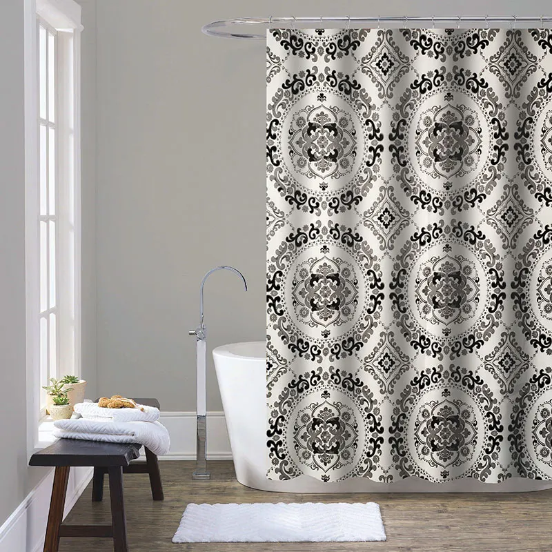Занавеска для душа из 100 полиэстера с принтом с повторяющимся дизайном, размером 180x200мм.brКомплектация: Металлические люверсы-12шт., свинцовый утяжелитель, белые кольца-12 шт. в блистерной упаковке.br Рекомендации по уходу: деликатная стирка при температуре не более 30 градусов, сушка в естественных условиях, не гладить и не отбеливать.br После стирки можно замочить в теплой соленой воде для исключения разводов от порошка.br Преимущества: эстетичный внешний вид, износостойкость, приятная на ощупь, создает комфорт и уют, подходит к любому типу карнизовbrbr# занавеска для ванны # штора