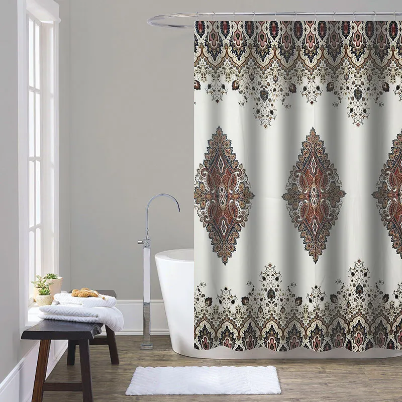Занавеска для душа из 100 полиэстера с принтом с повторяющимся дизайном, размером 180x200мм.brКомплектация: Металлические люверсы-12шт., свинцовый утяжелитель, белые кольца-12 шт. в блистерной упаковке.br Рекомендации по уходу: деликатная стирка при температуре не более 30 градусов, сушка в естественных условиях, не гладить и не отбеливать.br После стирки можно замочить в теплой соленой воде для исключения разводов от порошка.br Преимущества: эстетичный внешний вид, износостойкость, приятная на ощупь, создает комфорт и уют, подходит к любому типу карнизовbrbr# занавеска для ванны # штора