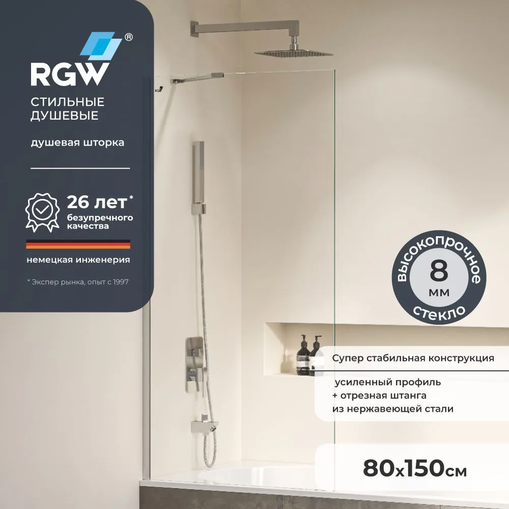 Данная шторка на ванну от бренда RGW — идеальное решение для тех, кто ценит стиль и безопасность. Стационарная конструкция из закаленного стекла толщиной 8 мм обеспечивает надежность и долговечность. Шторка легко устанавливается благодаря регулируемому профилю и универсальному монтажу, что делает её идеальным выбором для любой ванной комнаты.