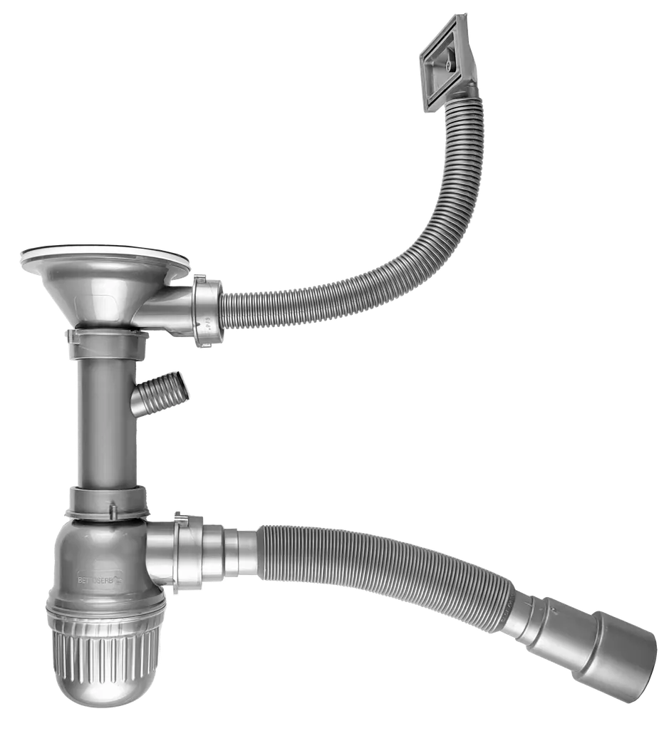 Сифон для кухонной мойки BETTOSERB с переливом и отводом для ПММ – универсальное решение для любой мойки Основные характеристики:? Регулируемая высота – 4,5 см, что позволяет легко подогнать под любую мойку? 2 типа перелива в комплекте – для нержавеющей стали (40?70 мм) и искусственного камня (?25 мм)? Отвод для посудомоечной машины – удобное подключение ПММ без дополнительных переходников? Универсальный крепеж – подходит для моек из нержавеющей стали и искусственного камня Технические параметры:? Габариты: 260?114?408/930 мм? Диаметр слива: 90 мм? Диаметр чаши: 114 мм? Диаметр фильтр-пробки: 80 мм? Подключение к канализации: 40/50 мм Преимущества:? Прочная конструкция из износостойких материалов? Простота монтажа благодаря полной комплектации? Надежная защита от протечек и запахов? Совместимость с большинством типов кухонных моек Комплектация: - Основной корпус сифона - Гофрированная труба - Фильтр-пробка - Крепежные элементы для разных типов моек - 2 варианта переливных систем - Отвод для подключения посудомоечной машины Идеальное решение для современной кухни с гарантией долговечности и удобства эксплуатации!