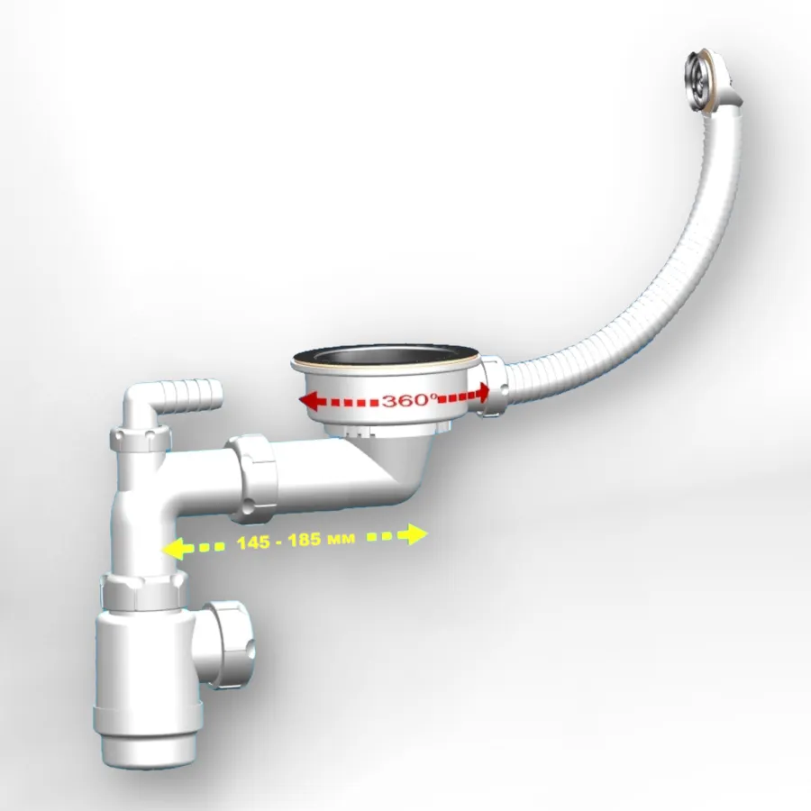 Сифон для кухонных моек с диаметром сливного отверстия 90мм, бутылочного типа. С разборным выпуском,нержавеющей решеткой, отводом для бытовой техники,с круглым переливом для композитных моек. Выход для подключения к канализации 40мм. Конструкция данного сифона имеет независимую поворотную систему, которая максимально увеличивает свободное пространство под мойкой и обеспечивает легкий процесс установки и подключения изделия. Поворотная пластиковая чаша создает быстрый слив воды из перелива независимо от его расположения в мойке. Корзинный нержавеющий клапан выпуска имеет дополнительные боковые отверстия, которые значительно увеличивают слив воды в канализацию. Данный сифон может дополнительно быть укомплектован декоративной накладкой