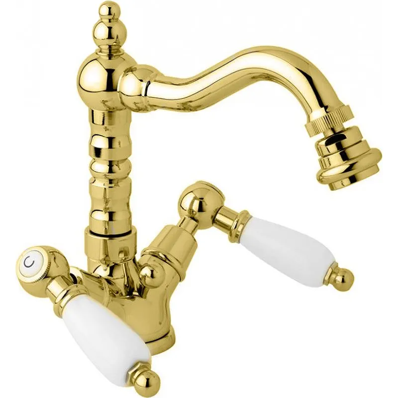 Смеситель для биде Cezares First-BS2-03/24-Bii.Двухвентильный смеситель с поворотным изливом и аэратором, монтируемый в одно отверстие. Имеет долгий срок эксплуатации за счет качественных деталей, неприхотлив в уходе. Станет прекрасным дополнением ванной комнаты в классическом или ретро стиле.Характеристики: Цвет корпуса: золото 24 карат. Цвет ручек: белый. Материал: латунь. Управление: вентильное. Механизм: керамическая кран-букса. Отверстия для монтажа: 1 отверстие. Рабочий интервал давления в водопроводной сети: 0,5-6 Атм. С аэратором. Тип подводки: гибкая. Стандарт подключения: G 1/2. В комплекте поставки: Смеситель. Донный клапан. Гибкая подводка. Крепления.