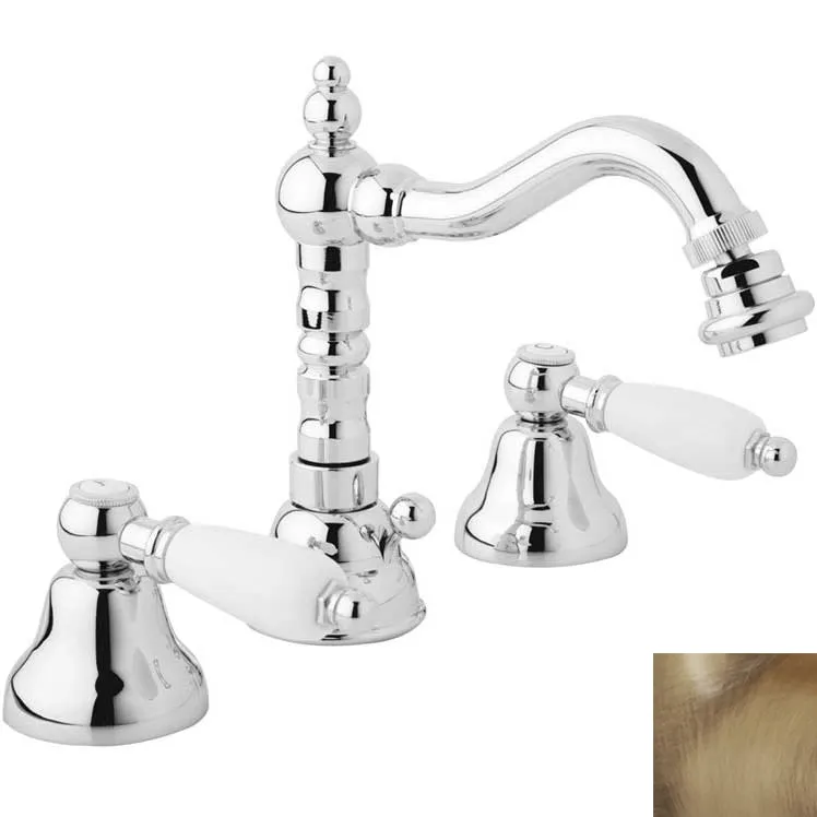 Смеситель для раковины Cezares First BBS2. Артикул: FIRST-BBS2-02-Bi.Двухвентильный смеситель с фиксированным изливом и аэратором, монтируемый в три отверстия. Имеет долгий срок эксплуатации за счет качественных деталей, неприхотлив в уходе. Станет прекрасным дополнением ванной комнаты в классическом или ретро стиле.Характеристики:Изготовлен из высококачественной латуни с гладким покрытием, которое не теряет цвет со временем, устойчиво к царапинам и превосходно защищает от коррозии.Цвет корпуса: бронза.Цвет ручек: белый.Длина излива: 15,5 см.Керамические кран-буксы - гарантия длительного срока службы.Рабочий интервал давления: 0,5 - 6 Атм.Донный клапан: G 1 1/4. Рычаг управления на корпусе смесителя.Стандарт подключения: G 1/2.В комплекте поставки: смеситель, донный клапан, гибкая подводка, крепления.