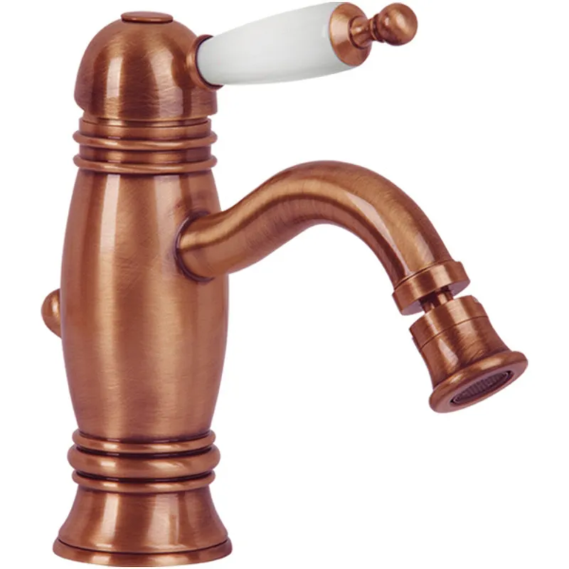 Смеситель для биде Migliore Oxford 19191.Характеристики: Цвет: медь. Материал: высококачественный латунный сплав. Специальное лаковое покрытие защищает внешнюю часть смесителя от быстрого износа. Однорычажная система управления. Утонченная ручка выполнена в белом цвете. Керамический картридж. Фиксированный излив с аэратором. Защита от обратного потока. Совместим с проточным водонагревателем. Стандарт подключения: G 1/2. Монтаж: на 1 отверстие. В комплекте поставки: смеситель, гибкая подводка.