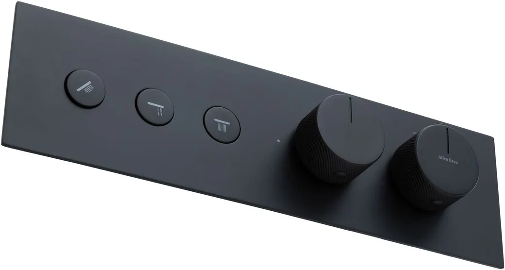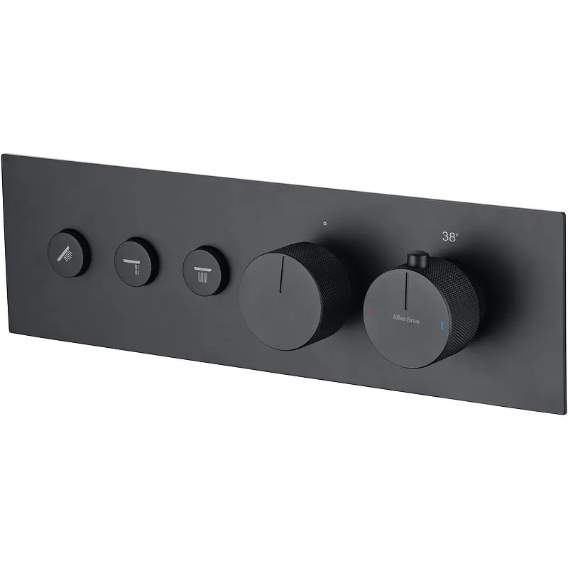 Смеситель для душа Allen Brau Liberty 5.33003-31 с термостатом.Характеристики: Цвет: черный матовый. Материал: латунь. Управление: термостат. Механизм: термостатический картридж. Стандарт подводки: G 1/2. Переключатель режимов: Push Key (нажимной). На 3 потребителя. Монтаж: встраиваемый. В комплекте поставки: Смеситель для душа (внешняя и внутренняя части).