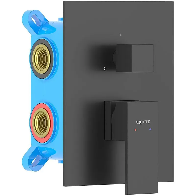 Смеситель для душа Aquatek Либра AQ1647MB.Характеристики: Цвет: черный матовый. Материал: латунь. Материал рукоятки: цинковый сплав. Управление: однорычажное, система регулировки силы струи и температуры воды. Механизм: керамический картридж Citec 35 мм. Количество потребителей: 3. Дивертор: поворотный. Стандарт подводки: G 1/2. Отверстия для монтажа: 1. Монтаж: встраиваемый. В комплекте поставки: Смеситель для душа (внешняя и внутренняя часть). Декоративная накладка на стену из нержавеющей стали 3 мм.