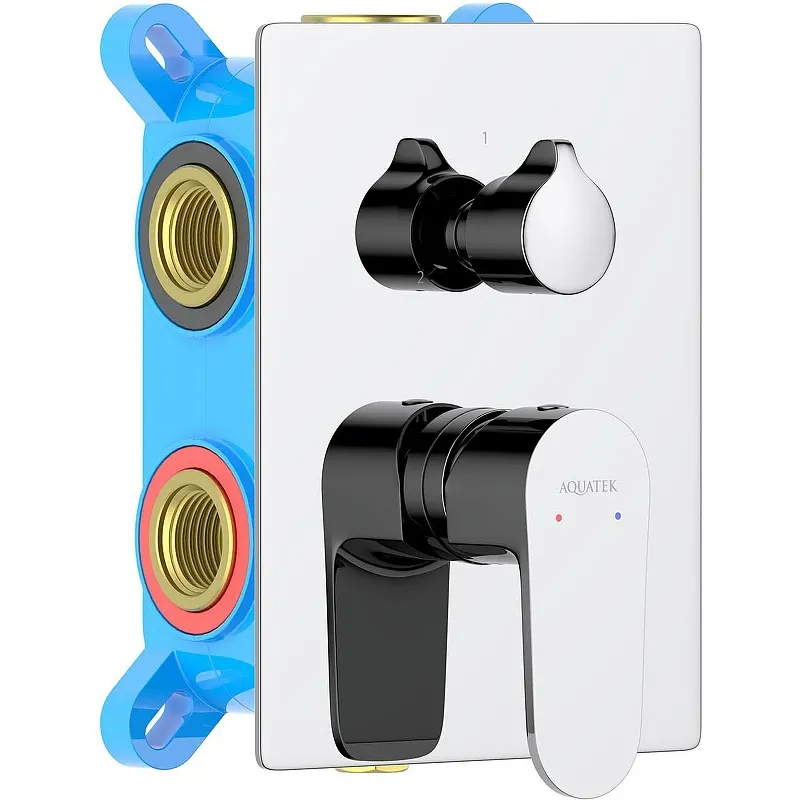 Смеситель для душа Aquatek Оберон AQ1247CR.Характеристики: Цвет: хром. Материал: латунь. Управление: однорычажное, система регулировки силы струи и температуры воды. Механизм: керамический картридж Citec 35 мм. Количество потребителей: 3. Дивертор: поворотный. Стандарт подводки: G 1/2. Отверстия для монтажа: 1. Монтаж: встраиваемый. В комплекте поставки: Смеситель для душа (внешняя и внутренняя часть). Декоративная накладка на стену из нержавеющей стали 3 мм.