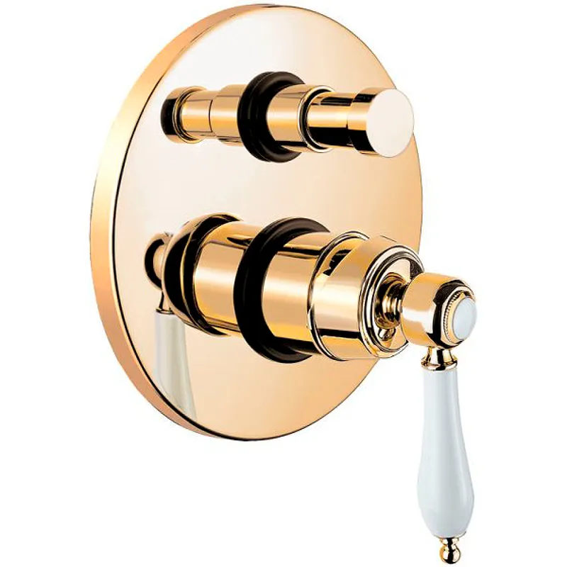 Смеситель для душа Cezares Aphrodite APHRODITE-VDIM2-03/24-Bi.Характеристики: Цвет: золото 24 карат. Цвет ручки: белый. Материал: латунь. Управление: однорычажное. Механизм: керамический картридж. Стандарт подводки: G 1/2. Дивертор. Рабочий интервал давления в водопроводной сети: 0.5-6.0 Атм. Монтаж: встраиваемый. В комплекте поставки: Смеситель для душа (внешняя и внутренняя части).
