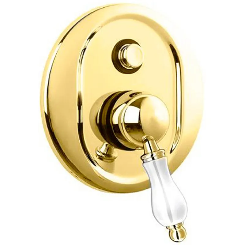 Поверхность: золото 24 карата. Ручка: белая. Корпус: высококачественная латунь. Декоративная накладка. Механизм: керамический картридж. Переключатель потоков: двухпозиционный. Стандарт подключения: G 1/2. Рабочий интервал давления: 0,5-6 Атм.