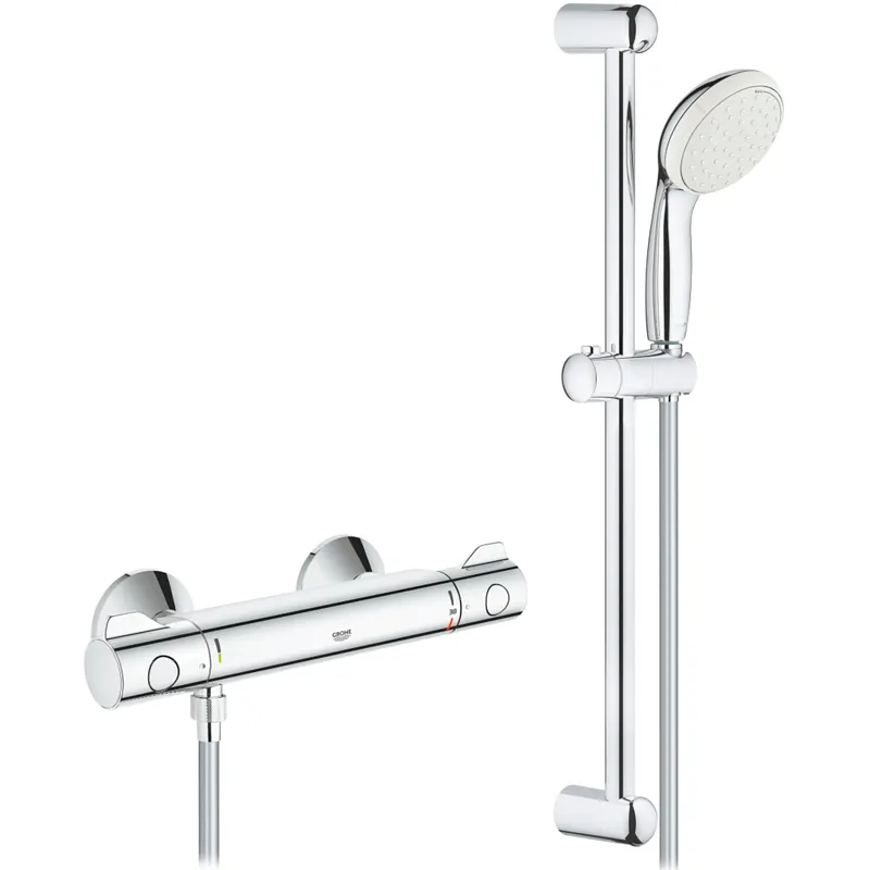 Смеситель для душа Grohe Grohtherm 800 34565001 с термостатом и душевым гарнитуром.Характеристики: Цвет: хром. Материал: латунь. Технология Grohe Long-Life Shine: стойкий сверкающий блеск. Металлическая розетка. Управление: термостат. Механизм: Grohe TurboStat компактный картридж с восковым термоэлементом. Стандарт подводки: 1/2. Grohe SafeStop стопор безопасности при 38 градусов. Grohe SafeStop Plus опционно ограничитель температуры на 43 градуса, включен. Встроенный стопор смешанной воды. Grohe EcoButton рукоятка регулировки напора с кнопкой для экономии воды и индивидуально устанавливаемым стопором. Carbodur керамический вентиль 1/2, 180 градусов. Отвод для душа снизу 1/2. Встроенные обратные клапаны. Грязеулавливающие фильтры. Защита от обратного потока. Скрытые S-образные эксцентрики. Grohe Water Saving Технология совершенного потока при уменьшенном расходе воды. Душевая штанга: 600 мм. Длина душевого шланга Relexaflex: 1750 мм. TwistStop против перекручивания шланга. Количество режимов струи ручного душа: 2. Grohe DreamSpray превосходный поток воды. Система SpeedClean против известковых отложений. Внутренний охлаждающий канал для продолжительного срока службы. ShockProof силиконовое кольцо, предотвращающее повреждение поверхности при падении ручного душа. Может использоваться с проточным водонагревателем. Минимальное давление 1,0 бар. Монтаж: на стену. В комплекте поставки: Смеситель для душа. Ручной душ. Душевая штанга. Душевой шланг. Держатель ручного душа.