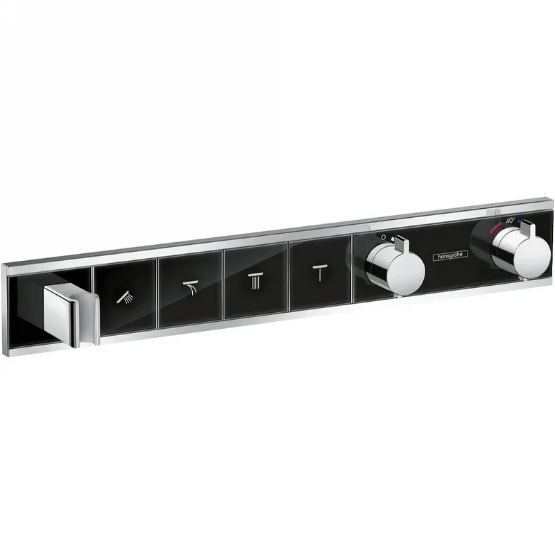 Смеситель для душа Hansgrohe RainSelect 15357600 с термостатом.Характеристики: Цвет: черный, хром. Материал: латунь. Управление: термостат. Механизм: термостатический картридж, клапан Select. Взависимости от объемного расхода и условий установки снижение объема расхода воды приблизительно на 50 процентов и встроенная функция отключения. Кнопка Select включения / выключения для 4-х потребителей (ручной душ, Waterfall, Rain large, Mono). Одновременное использование нескольких выходных отверстий. Объем расхода воды на выходное отверстие: 26 л/мин. Объем расхода воды при одновременном использовании всех выходных отверстий: 38 л/мин. Минимальный напор воды: 1 бар. Максимальный напор воды: 10 бар. Предохранительная остановка при 40 градусах. Регулируемое ограничение температуры. Защита от обратного потока. Для душевых шлангов с конической или цилиндрической гайкой с обеих сторон. Встроенный держатель душа. Стандарт подводки: 3/4. Монтаж: встраиваемый. В комплекте поставки: Смеситель для душа (внешняя часть). Крепежный материал. Инструкция по монтажу.