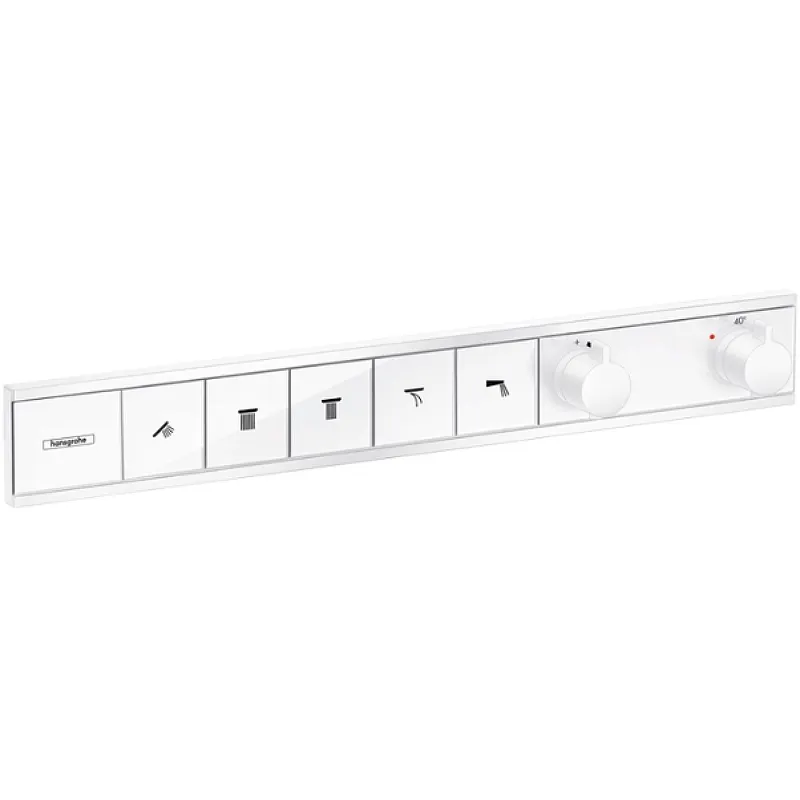 Смеситель для душа Hansgrohe RainSelect 15384700 с термостатом.Характеристики: Цвет: белый матовый. Материал: латунь. Управление: термостат. Механизм: термостатический картридж, клапан Select. В зависимости от объемного расхода и условий установки снижение объема расхода воды приблизительно на 50 процентов и встроенная функция отключения. Кнопка включения/выключения Select для управления 5-ю выходными отверстиями. Одновременное использование нескольких выходных отверстий. Максимальный объем расхода воды при 3 барах: 38 л/мин. Объем расхода воды при одновременном использовании всех выходных отверстий: 38 л/мин. Минимальный напор воды: 1 бар. Максимальный напор воды: 10 бар. Предохранительная остановка при 40 градусах. Регулируемое ограничение температуры. Защита от обратного потока. Термостат с кнопками (ручной душ, PowderRain, водопад, широкая струя Rain и душ для плечевой зоны). Стандарт подводки: 3/4. Монтаж: встраиваемый. В комплекте поставки: Смеситель для душа (внешняя часть). Крепежный материал. Инструкция по монтажу.
