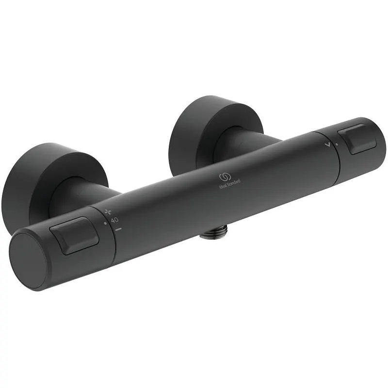 Настенный смеситель для душа Ideal Standard Ceratherm T25 A7201XG с термостатом.Характеристики: Материал: латунь. Цвет: Silk Black (черный шелк). Механизм: термостатический картридж IS. Затворы на керамических дисках G1/2 180 градусов. Технология Cool body (холодный корпус). Пластиковые рукоятки с ограничителями температуры (40 градусов) и потока воды (50 процентов). Встроенный обратный клапан. Монтаж: на стену. Отверстия для монтажа: 2. В комплекте поставки: смеситель.