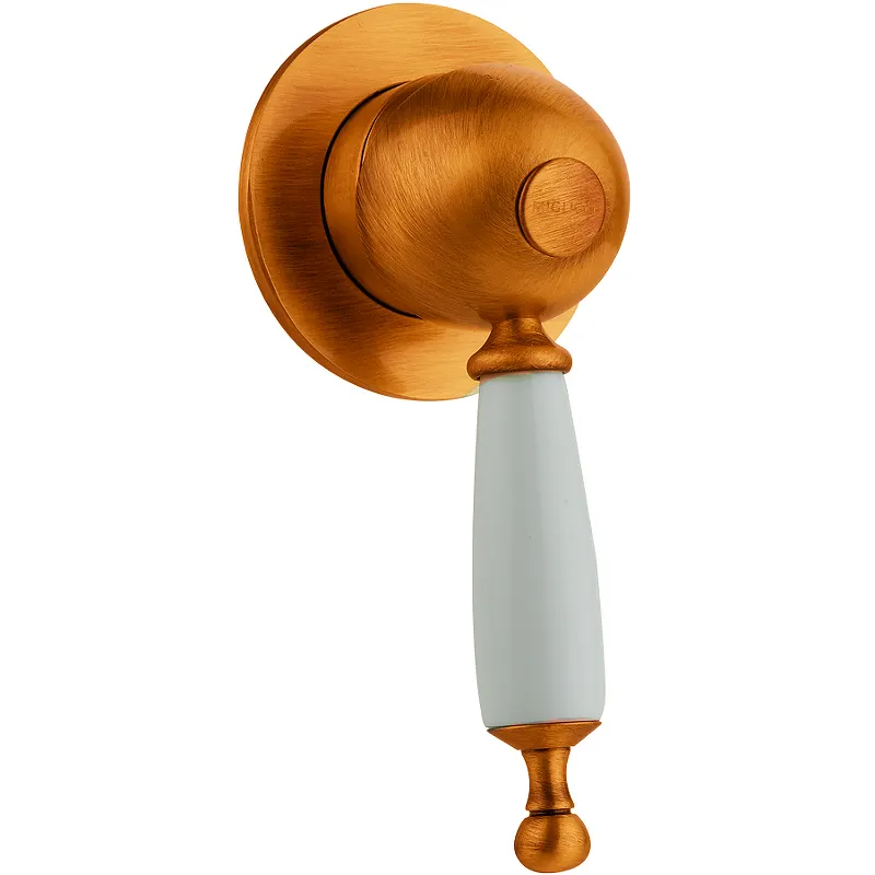 Смеситель для душа Migliore Oxford 19205.Характеристики: Цвет: медь. Материал: высококачественный латунный сплав. Специальное лаковое покрытие защищает внешнюю часть смесителя от быстрого износа. Однорычажная система управления. Утонченная ручка выполнена в белом цвете. Керамический картридж. Переключатель потока. Стандарт подключения: G 1/2. Монтаж: встраиваемый. В комплекте поставки: смеситель (внешняя и внутренняя часть).