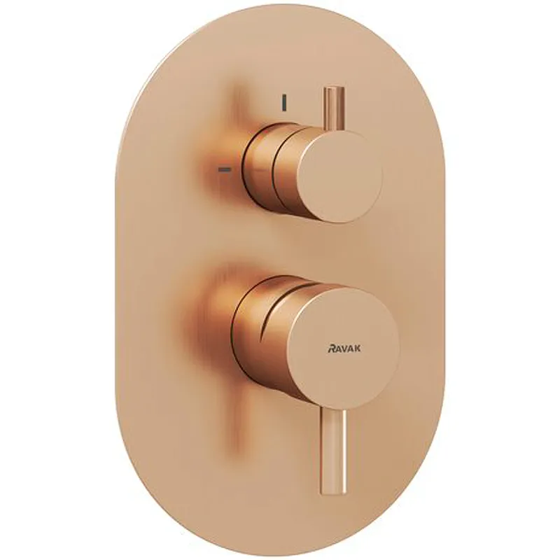 Смеситель для душа Ravak Espirit ES 065.60RGB.O2 X070362 на 2 потребителя.Характеристики: Цвет: розовое золото. Поверхность: матовая. Материал: латунь. Управление: однорычажное. Механизм: керамический картридж 35 мм. Стандарт подводки: G 1/2. Монтаж: встраиваемый. В комплекте поставки: Смеситель для душа (внешняя часть).