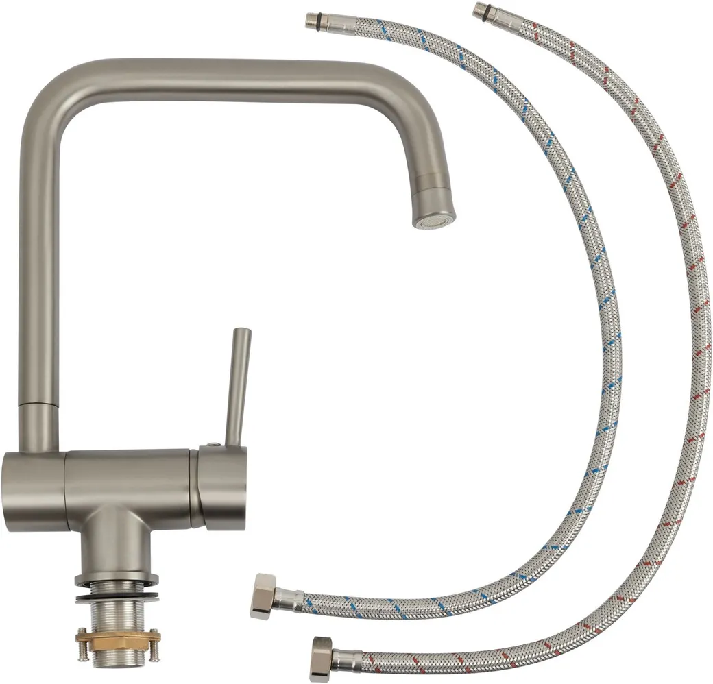 Смеситель для кухни Allen Brau Fenster 5.60004-BN.Характеристики: Цвет: никель брашированный. Материалы: латунь. Управление: однорычажное. Механизм: керамический картридж Kerox. Излив: поворотный 360 градусов. Стандарт подводки: G 1/2. Тип подводки: гибкая. Аэратор. Монтаж: на мойку/столешницу. В комплекте поставки: Смеситель для кухни. Гибкая подводка. Аэратор.