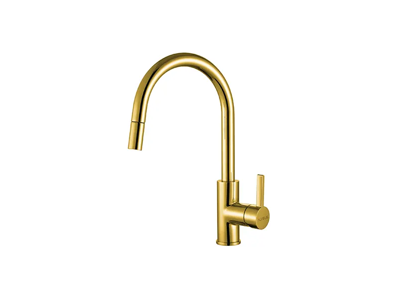 - Элегантный дизайн: Латунное покрытие придаёт смесителю роскошный вид, идеально вписываясь в современную кухню.
