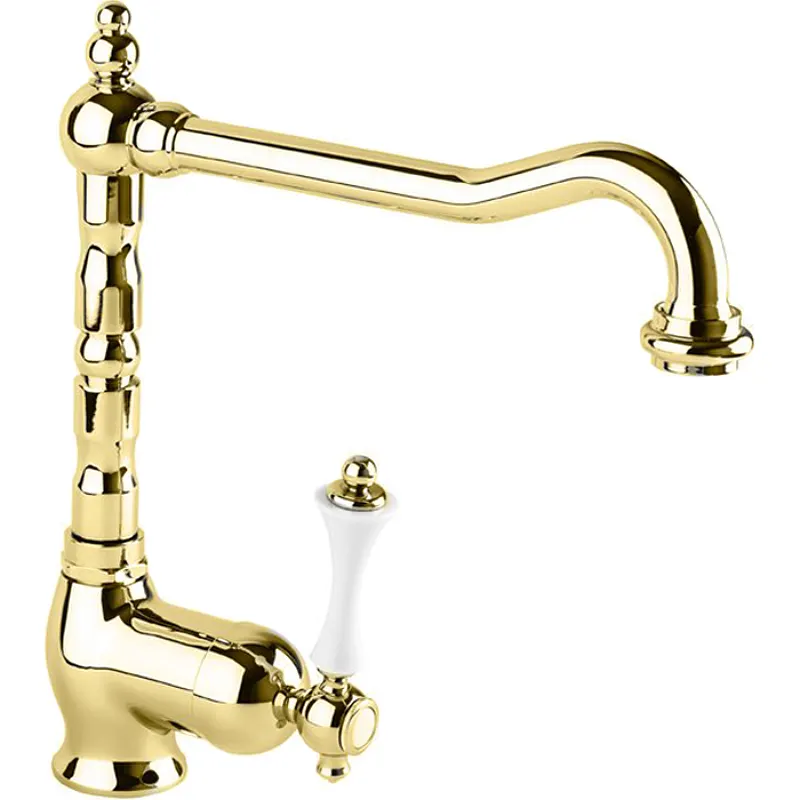 Смеситель для кухни Cezares Margot MARGOT-LLM2-03/24-Bi однорычажный с поворотным изливом.Коллекция Margot от производителя Cezares это утонченные классические линии корпуса и разнообразие ручек смесителей. Этот образец безупречного мастерства несомненно создаст изысканный акцент в интерьере. Практичность изделия позволит использовать его с удобством и наслаждением.Характеристики: Цвет: золото 24 карат. Материал: латунь. Цвет ручки: белый. Управление: однорычажное. Стандарт подводки: G 1/2. Тип подводки: гибкая. Механизм: керамический картридж. Отверстия для монтажа: 1 отверстия. Монтаж: на мойку, на столешницу. С аэратором. Излив: поворотный. Форма излива: традиционная. Рабочий интервал давления: 0.5-6 Атм. В комплекте поставки: смеситель.