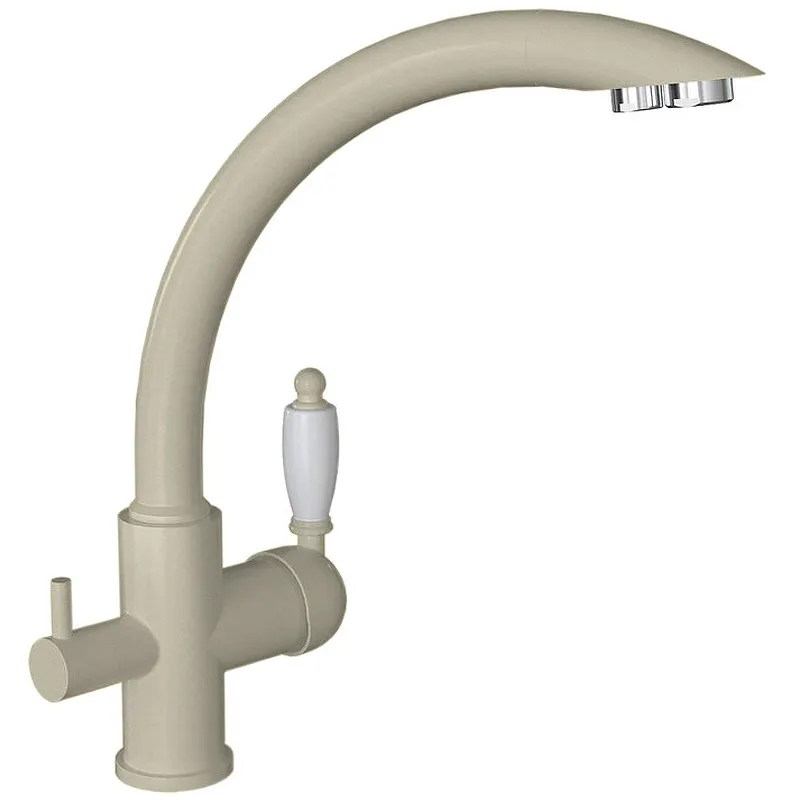 Смеситель для кухни под фильтр Florentina Шале 333.25H.2113.202 с поворотным изливом.Имеет долгий срок эксплуатации за счет качественных деталей, неприхотлив в уходе.Технические данные: Цвет: шампань. Материал: латунь. Покрытие: гранит. Длина излива: 22,2 см. Керамический картридж 35 мм. Излив: поворотный. Отдельный излив для питьевой воды. Рычаг с керамической ручкой белого цвета. Тип управления: однорычажный. Гибкая подводка: G 1/2. Монтаж: на мойку. В комплекте поставки: Смеситель. Гибкая подводка. Подключение для фильтра. Инструкция.