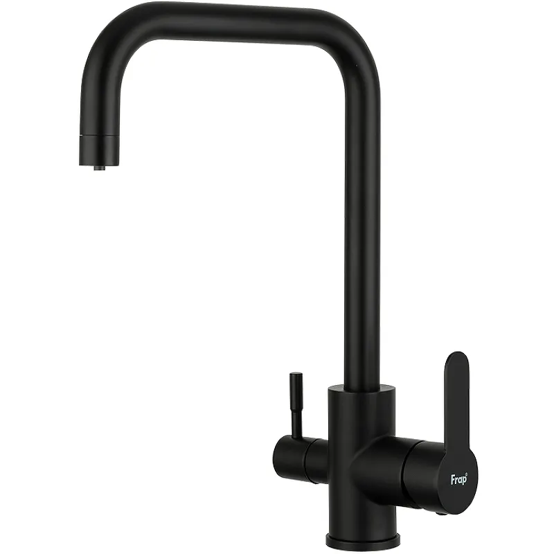 Смеситель для кухни Frap H801 F43801-6 с краном для питьевой воды.Характеристики: Цвет: черный матовый. Материал: нержавеющая сталь. Управление: однорычажное. Излив: поворотный, с каналом для питьевой воды. Монтаж: на мойку, на столешницу. Механизм: керамический картридж. Стандарт подводки: G 1/2. Тип подводки: гибкая. Аэратор. В комплекте поставки: Смеситель. Гибкая подводка. Комплект креплений.