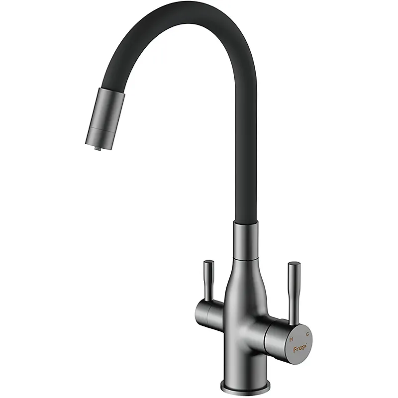 Смеситель для кухни Frap H96 F4396-15 с гибким изливом.Характеристики: Цвет: оружейная сталь. Материал: нержавеющая сталь, силикон. Управление: однорычажное. Излив: гибкий, с каналом для питьевой воды. Монтаж: на мойку, на столешницу. Стандарт подводки: G 1/2. Тип подводки: гибкая. Механизм: керамический картридж. Аэратор. В комплекте поставки: Смеситель. Гибкая подводка. Комплект креплений.