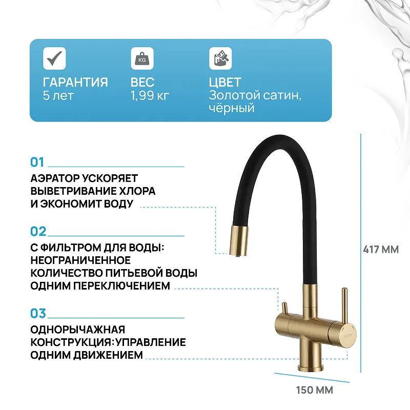 - Стильный дизайн и функциональность: Современный смеситель для кухни с золотым сатином и черным цветом идеально вписывается в любой интерьер.