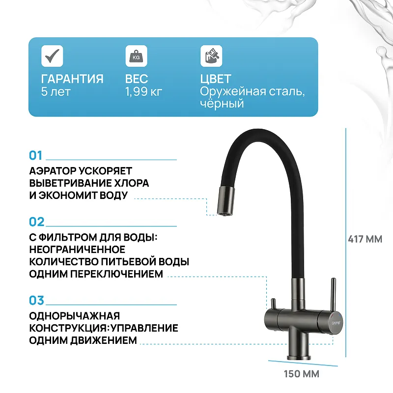 - Удобство монтажа: Монтаж на мойку или столешницу требует всего 1 отверстие, что упрощает установку.