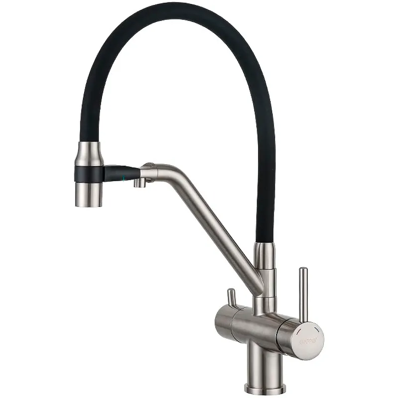 Смеситель для кухни Gappo G4398-85 с краном для питьевой воды и гибким изливом.Характеристики: Цвет: сатин, черный. Материал: латунь. Управление: однорычажное. Механизм: керамический картридж 35 мм. Излив: поворотный, гибкий. Стандарт подводки: G 1/2. Тип подводки: гибкая. Количество режимов струи: 2. С возможностью подключения к фильтру. Аэратор. Тип крепления: шпилька. Отверстий для монтажа: 1. Монтаж: на мойку/на столешницу. В комплекте поставки: Смеситель. Гибкая подводка. Комплект креплений.